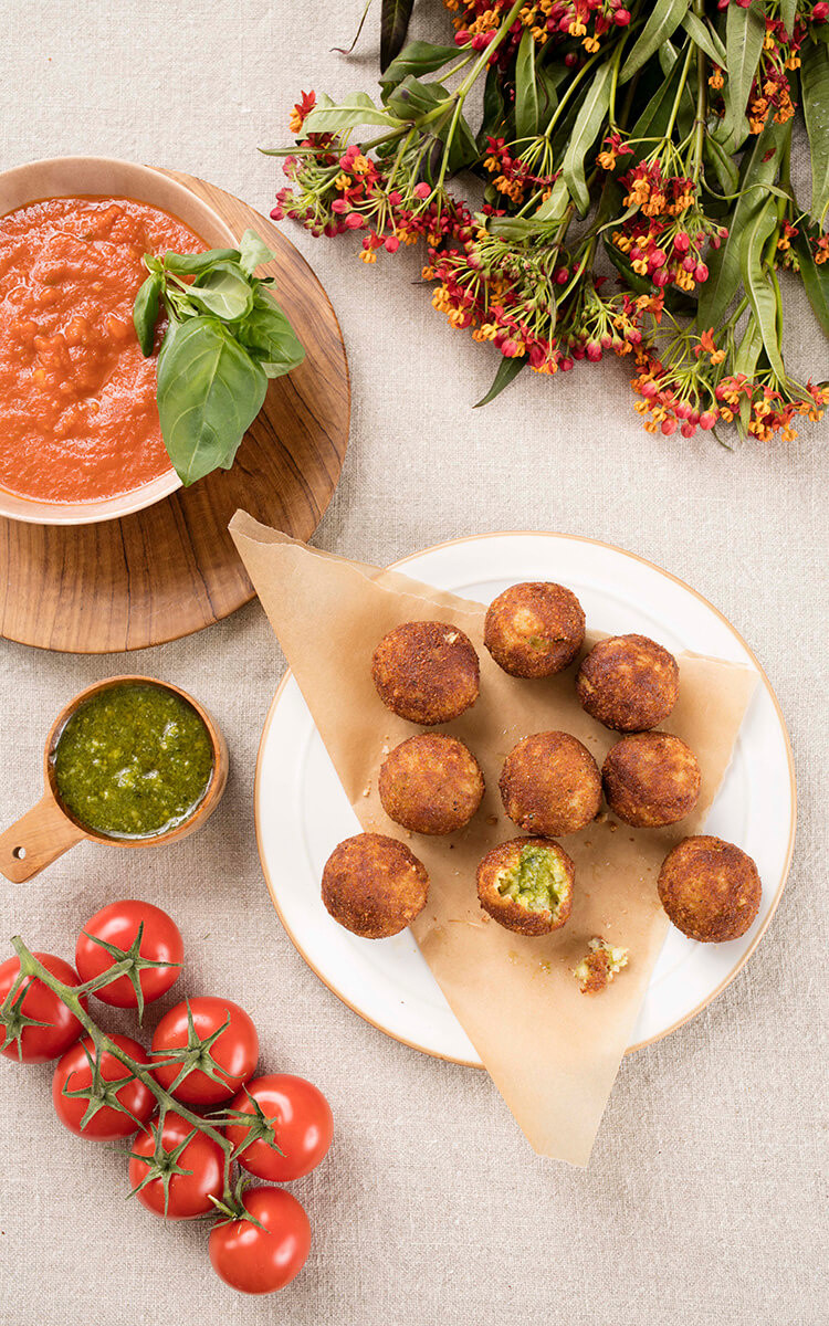 Mettete il pangrattato in un contenitore, rotolate le palline ordinandole sul foglio di cottura e lasciatele raffreddare per un’ora (gli arancini da friggere possono anche essere preparati fino a due giorni in anticipo e refrigerati fino all'uso).