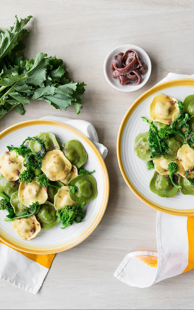 In una pentola lessate le cime di rapa per circa 7 minuti in abbondante acqua salata, unite i ravioli e proseguite la cottura per 3 minuti scarsi.