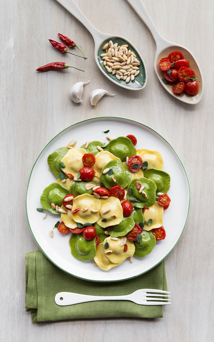 Tagliate l’aglio a lamelle e i pomodorini a metà. In una padella fate rosolare l’aglio, i pomodorini e il peperoncino con 4 cucchiai di olio, aggiungete i pinoli e lasciateli fino a quando diventano dorati.