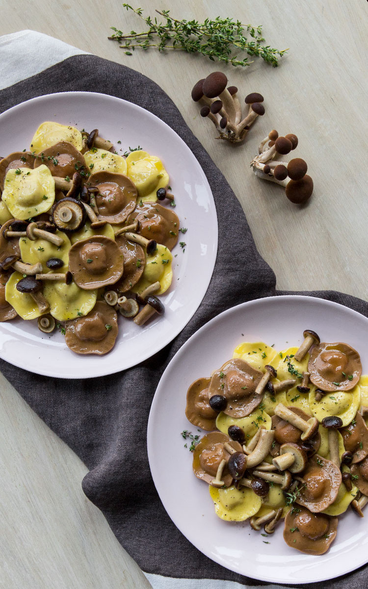 Nel frattempo portate ad ebollizione una pentola di acqua salata e cuocete i ravioli per 3 minuti. Scolateli e trasferiteli in padella, quindi mantecate con i funghi e il Parmigiano Reggiano. Guarnite il piatto con qualche ciuffetto di timo fresco.