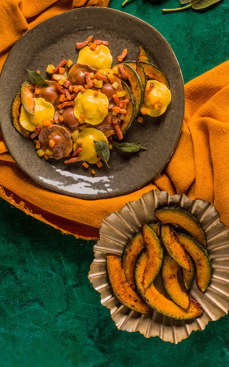 Cuocete i ravioli in abbondante acqua salata, scolateli e trasferiteli nella padella col ragù; spadellateli brevemente per avvolgerli nel condimento e serviteli accompagnando ogni porzione con qualche fetta di zucca dorata.