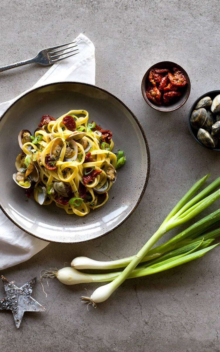 Fettuccine con guazzetto di vongole, pomodori secchi e cipollotti