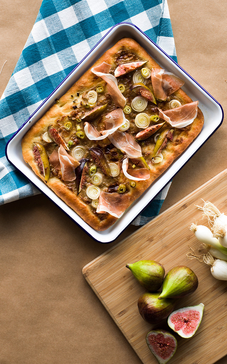 Focaccia al Pesto di Noci con crudo, fichi e cipollotti