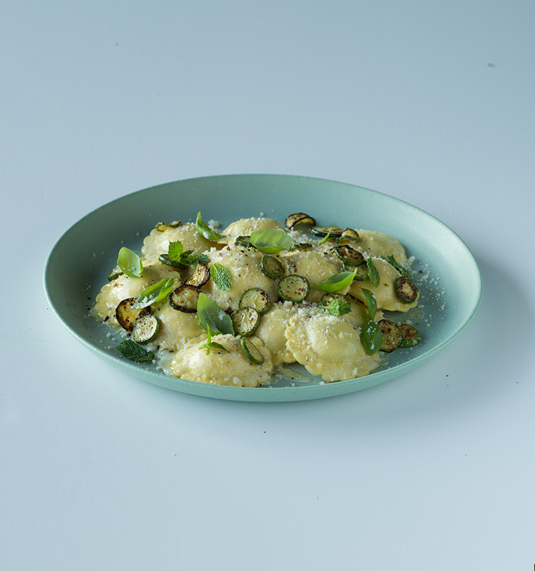 Tagliate le zucchine a rondelle e soffriggetele in olio evo, portatele a doratura e scolatele su carta assorbente. Cuocete i ravioli in abbondante acqua leggermente salata, scolateli dopo il tempo indicato sulla confezione. In una padella sciogliete una noce di burro e saltate le zucchine assieme ai ravioli, impiattate con parmigiano e menta fresca.