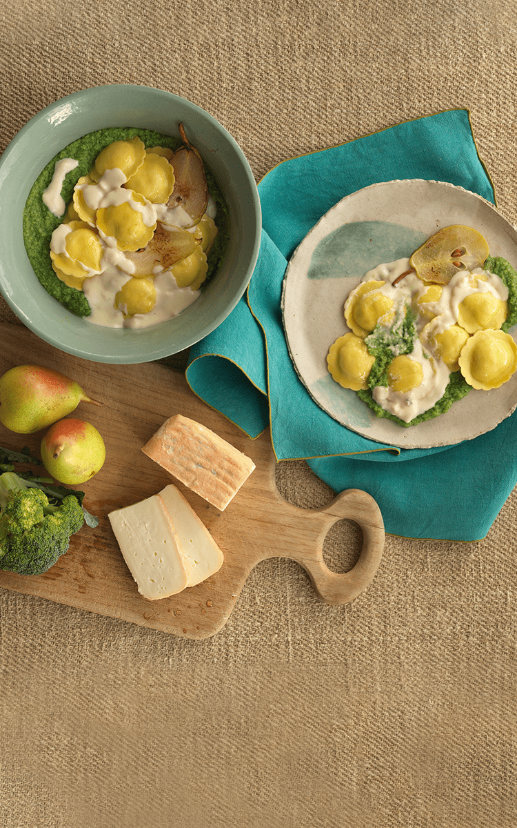 Distribuite nei piatti la crema di broccolo, i ravioli con la loro salsa al taleggio ed infine le pere arrostite.