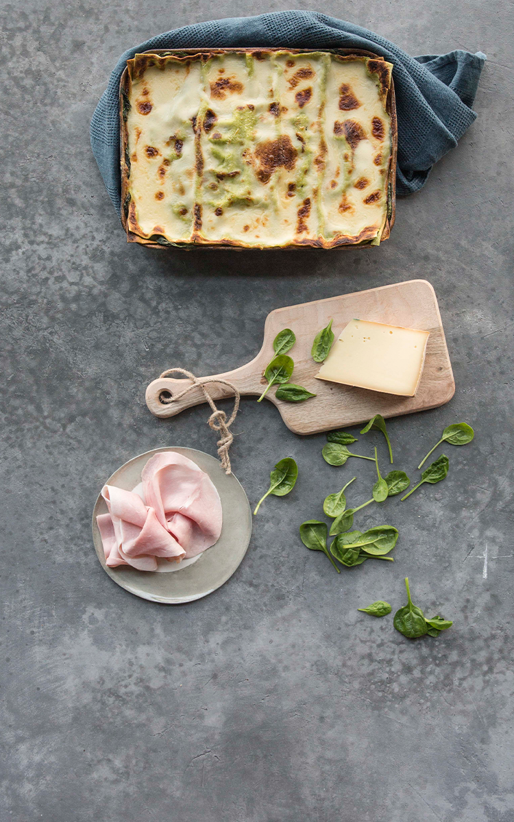 Imburrate una pirofila e stendete sul fondo un velo di besciamella. Fate uno strato di lasagne, disponetevi sopra uno strato di prosciutto, qualche fettina di fontina e un po’ di spinaci, coprite con la besciamella e ripetete gli strati fino ad esaurire gli ingredienti. Dopo aver disposto l’ ultimo strato di lasagne coprite bene con la besciamella e spolverizzate con il Parmigiano grattugiato.