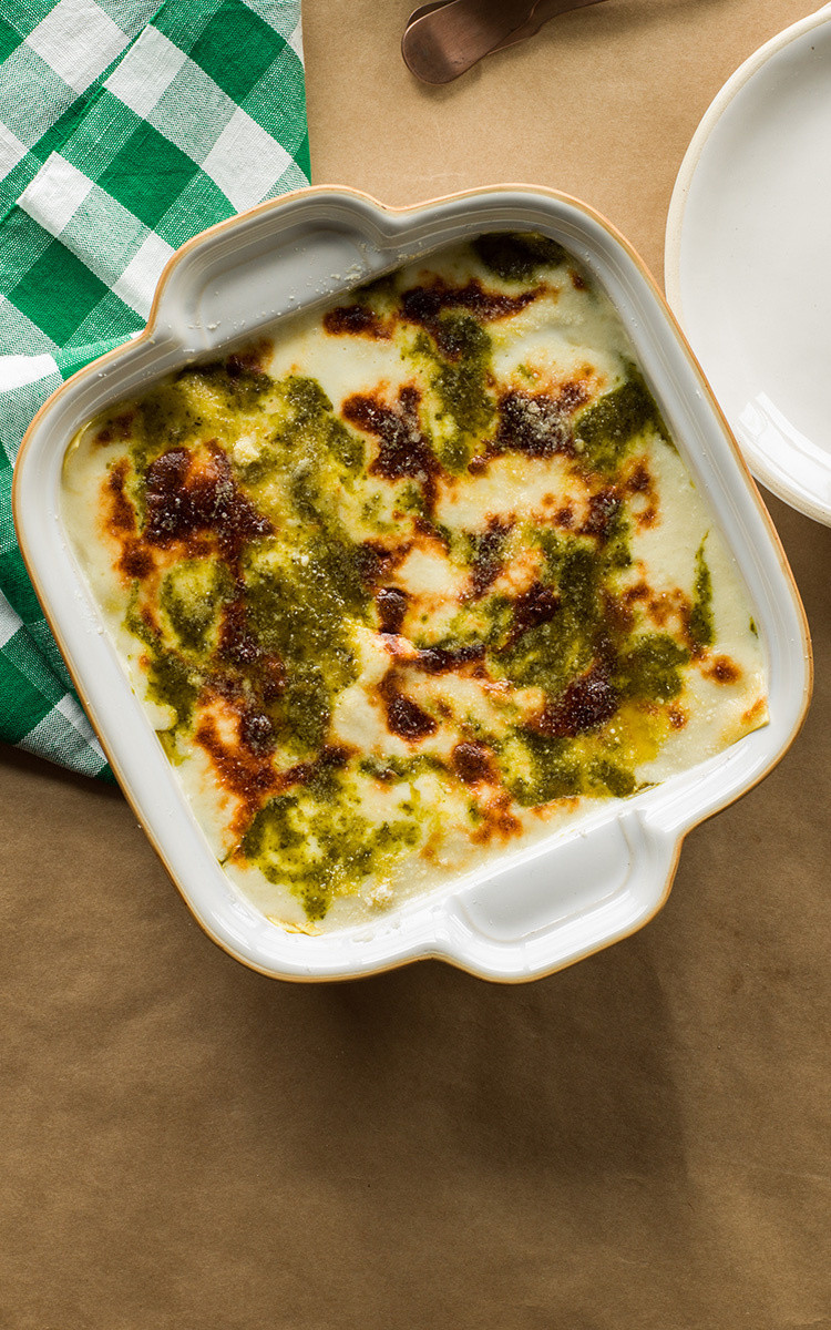 Terminate coprendo il tutto con un ultimo strato di besciamella, Pesto alla Genovese e Parmigiano Reggiano, che arrostirà durante la cottura diventando croccante.