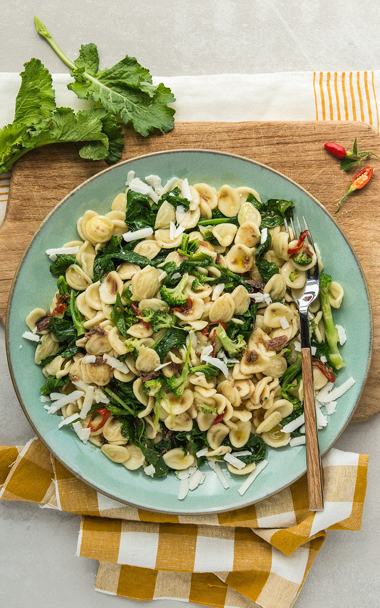 Scolate le cime di rapa con le orecchiettine al dente, trasferitele in padella col condimento e spadellate per pochi secondi per farle insaporire. Eliminate l’aglio.