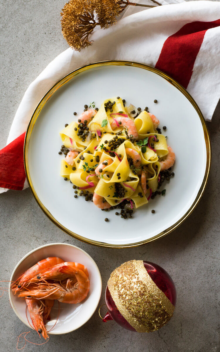 Nel frattempo, scaldate 4 cucchiai di olio in una larga padella antiaderente e saltate i gamberi per 2 minuti. Trasferite le pappardelle in padella assieme ai gamberi, unite le lenticchie e spadellate per pochi istanti.