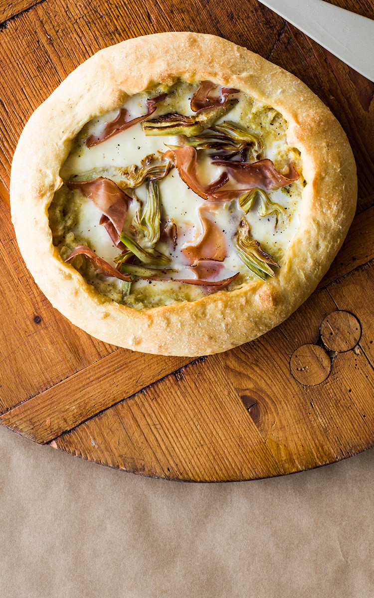Pizza al Sugo di Carciofo con stracchino, speck e carciofi