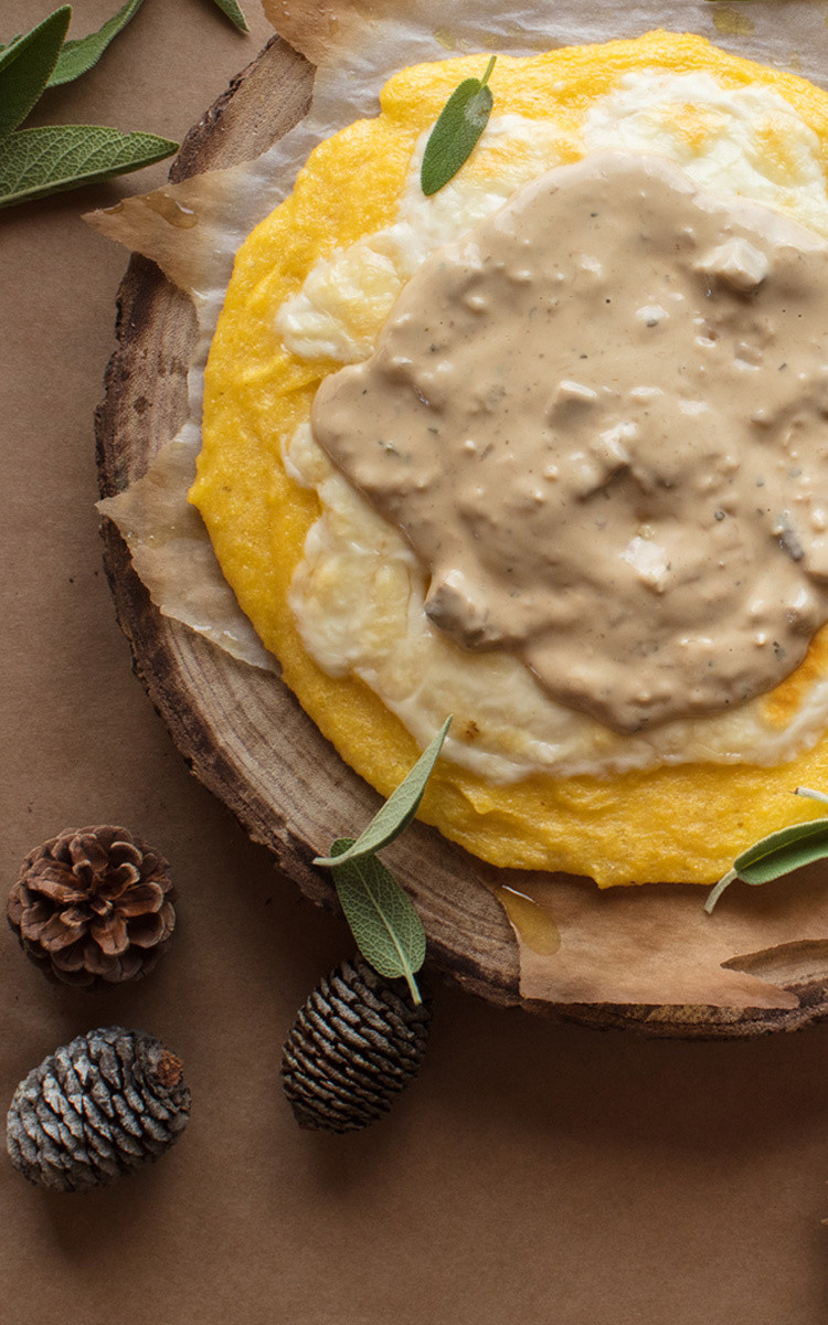Infornate per circa 5-6 minuti. Nel frattempo scaldate delicatamente i sugo fresco ai porcini Giovanni Rana. Sfornate la pizza di polenta e versatele sopra il sugo fino a coprirla tutta; aggiungete se lo gradite 2 o 3 foglie di salvia fresca.