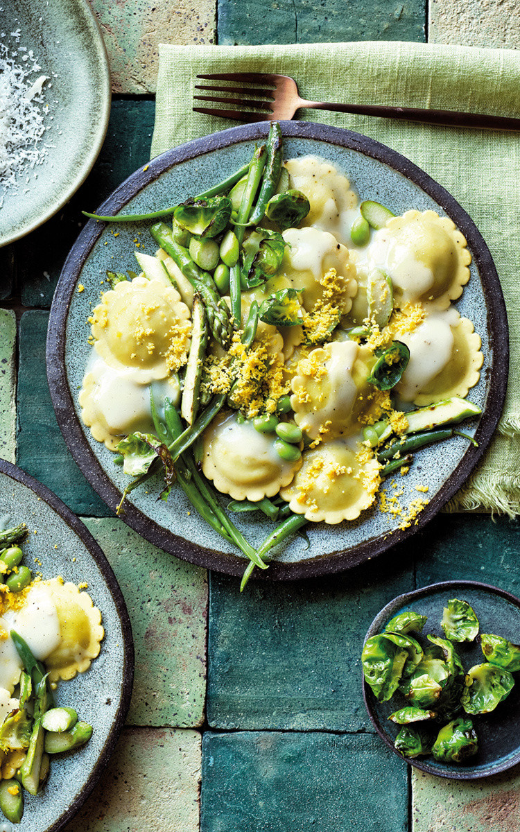 RAVIOLI GIOIAVERDE AGLI ASPARAGI, CREMA DI PARMIGIANO, PIOGGIA DI GREENS E MIMOSA D’UOVO