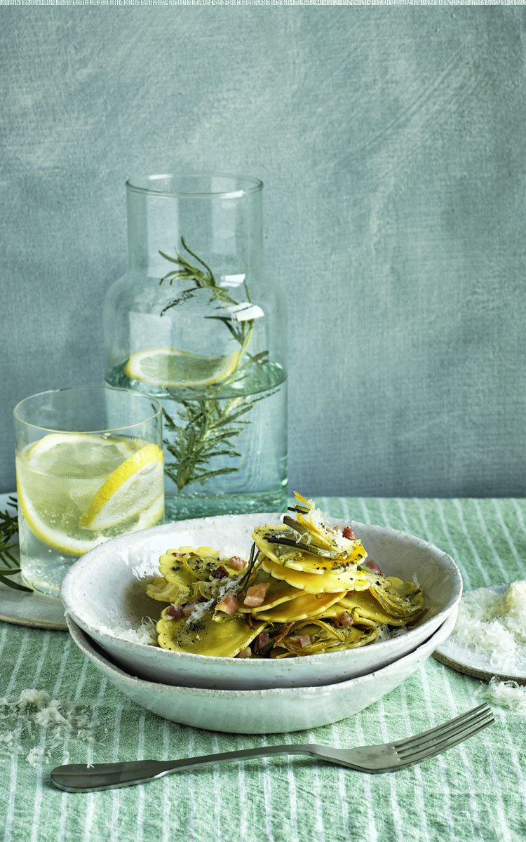 RAVIOLI RIPIENI DI CARCIOFI CON CARCIOFI FRITTI, PANCETTA CROCCANTE E PECORINO