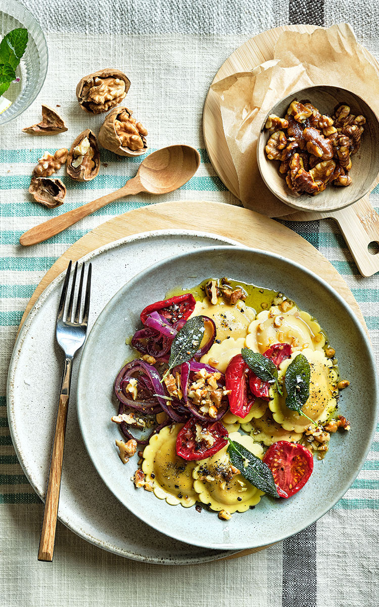 Cuocete i ravioli in abbondante acqua salata, scolateli e conditeli con le cipolle, i pomodori semi secchi e un filo d’olio. Disponeteli sui piatti, polverizzate con le noci tritate grossolanamente, una macinata di pepe e le foglie di salvia fritta.