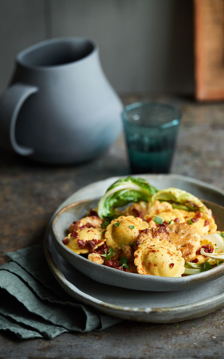 RAVIOLI RIPIENI DI RADICCHIO CON SPECK CROCCANTE, CAVOLFIORE E ORIGANO