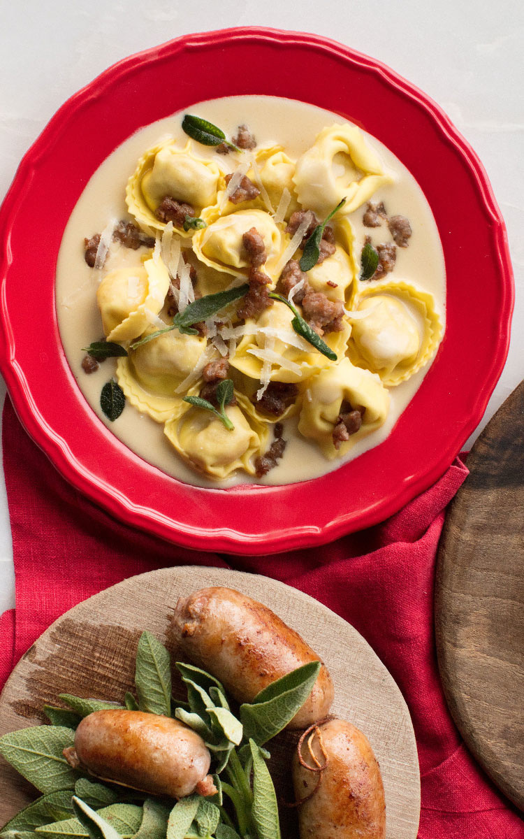Distribuite la fonduta di Parmigiano nei 2 piatti, aggiungete i tortellini e la salsiccia, condite con pepe nero macinato e servite.