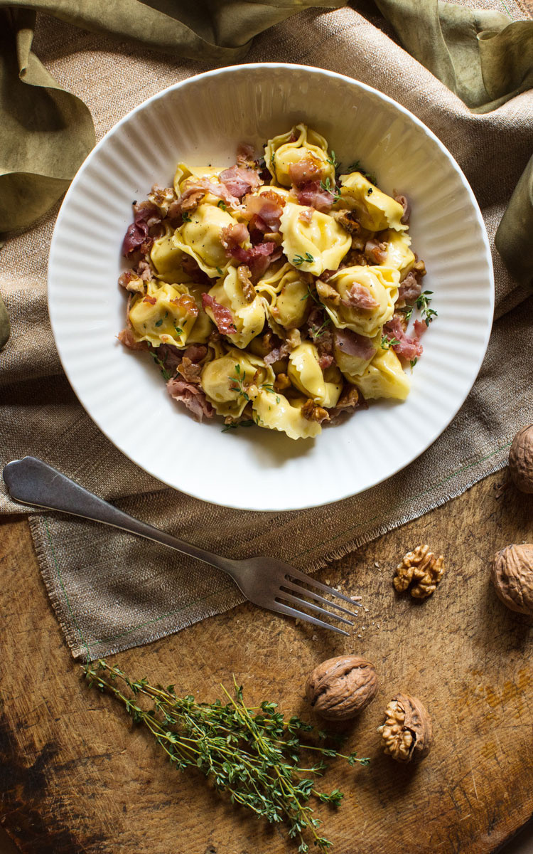 In una grande padella scaldate il burro fino a che non si scioglie. Aggiungete il prosciutto e saltate per 2 minuti fino a ottenere un po' di croccantezza. Aggiungete metà quantità di noci e una foglia di timo, condite con pepe nero macinato e mescolate per 1 minuto.