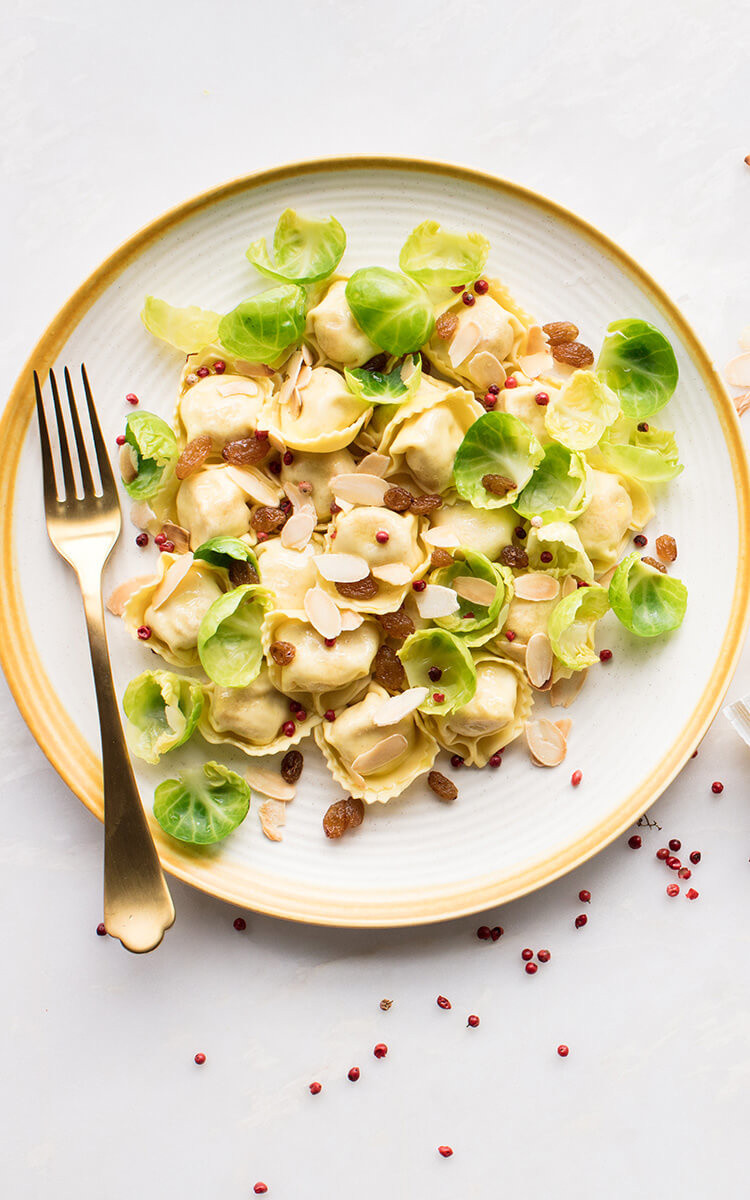 SFOGLIAGREZZA RICOTTA E SPINACI CON CAVOLETTI DI BRUXELLES, MANDORLE E UVETTA