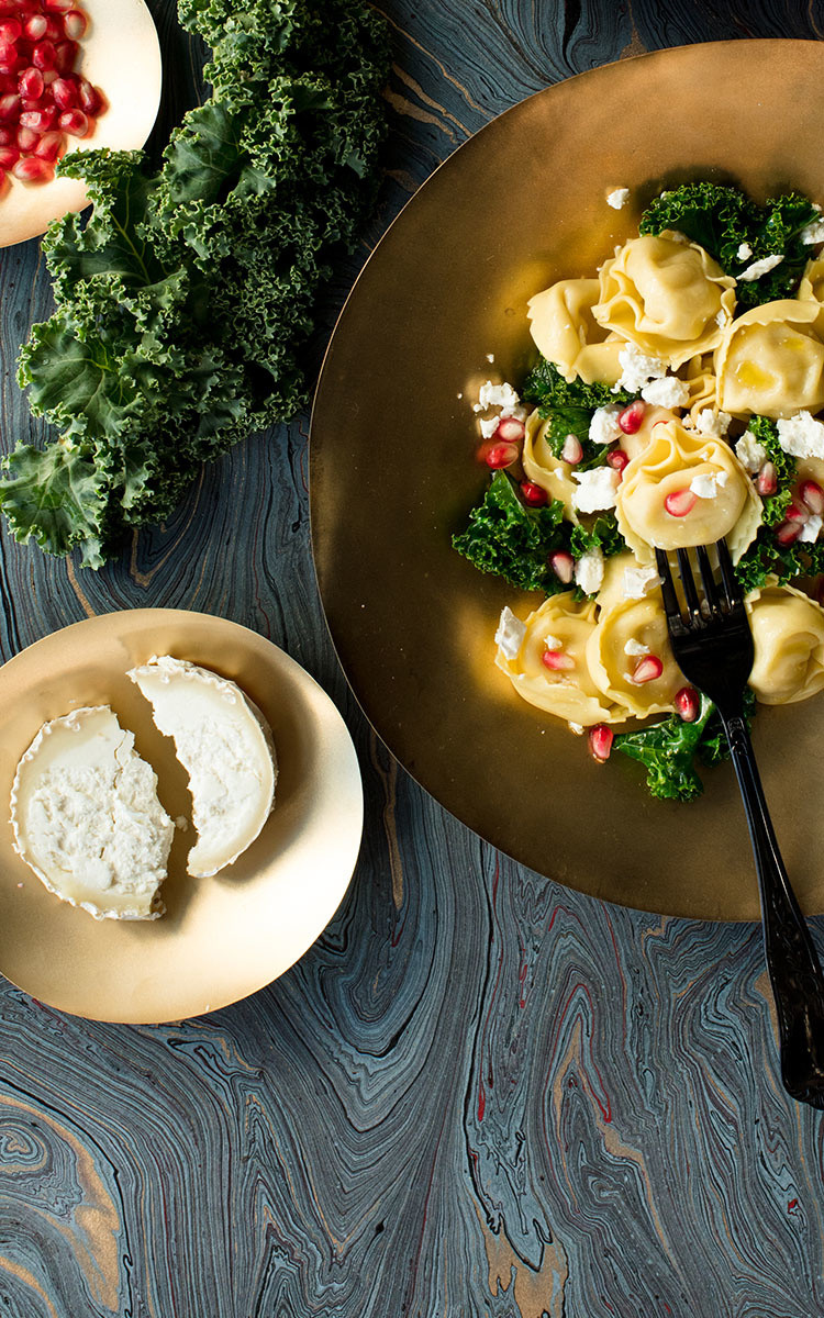 Scolate la pasta tenendo da parte un po’ d’acqua di cottura e mettete i Tortelloni nella padella aggiungendo metà del formaggio di capra e metà dei semi di melograno. Aggiungete l'olio rimanente e un cucchiaio d’acqua di cottura della pasta, se necessario, per rendere la salsa più cremosa e mescolare. Rimuovete lo spicchio d’aglio.