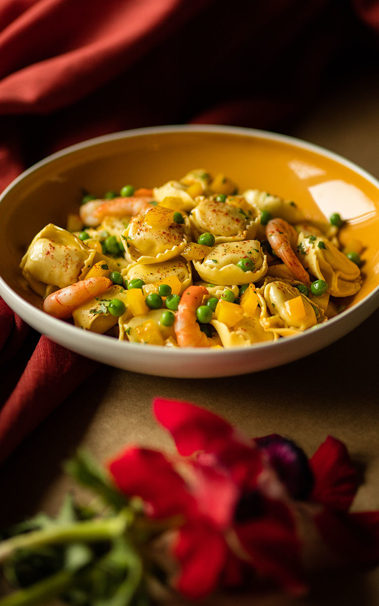 Cuocere i Tortelloni in abbondante acqua salata. Spadellare i pisellini primavera insieme ai gamberi pelati e ai peperoni nell’olio extra vergine di oliva. Aggiungere i Tortelloni cotti e lo zafferano.