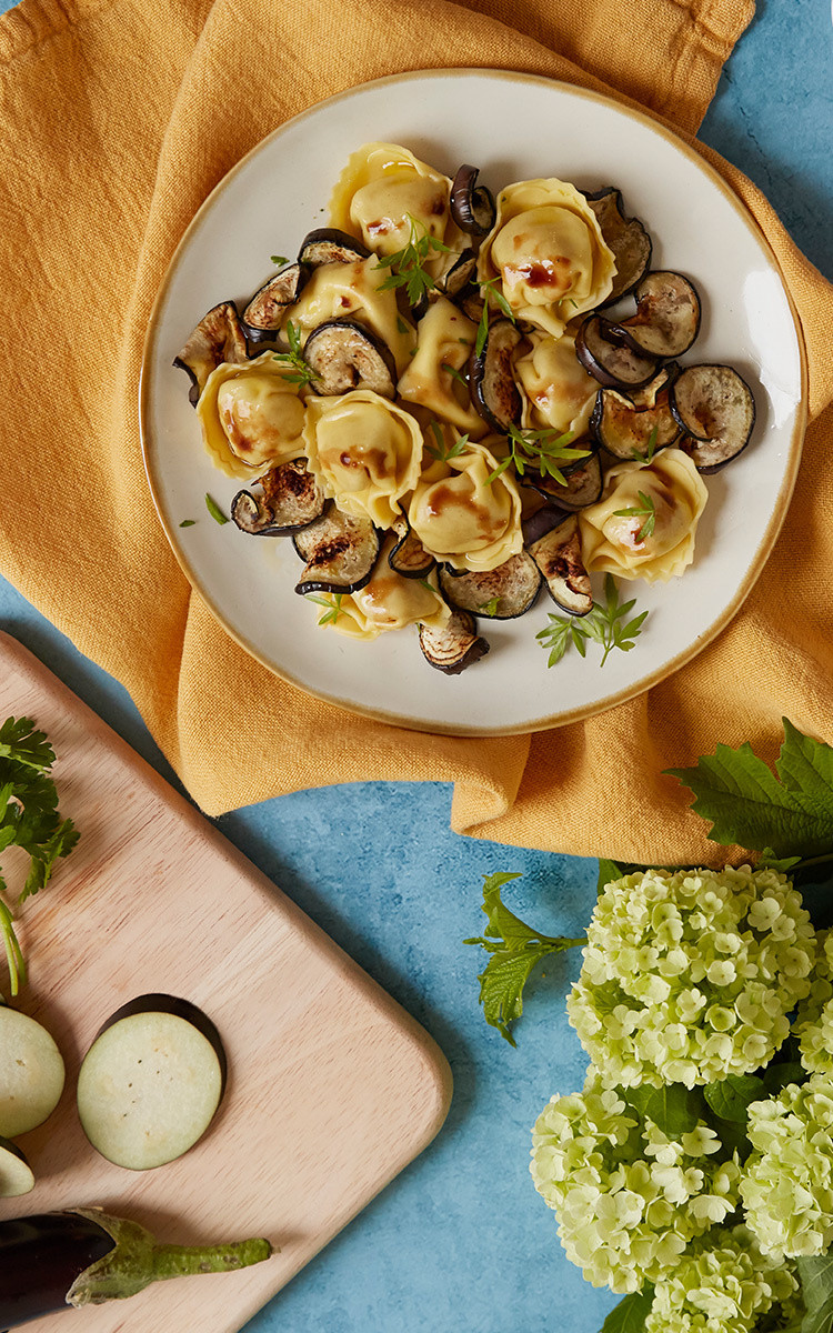 Sfogliavelo Crudo e Pecorino Romano con melanzane e gocce di aceto balsamico