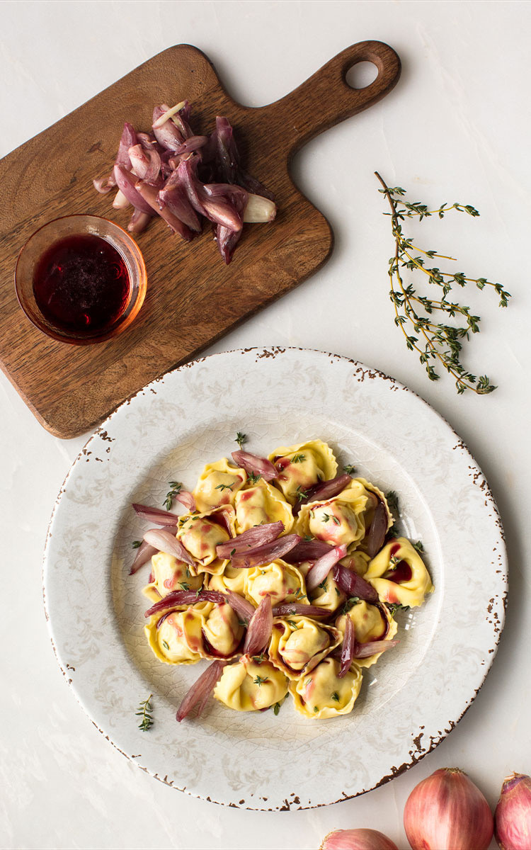 Nel frattempo portate ad ebollizione una pentola di acqua salata e cuocete i tortellini. Scolateli e trasferiteli in padella assieme agli scalogni e al vino, mescolando delicatamente. Condite a piacimento.