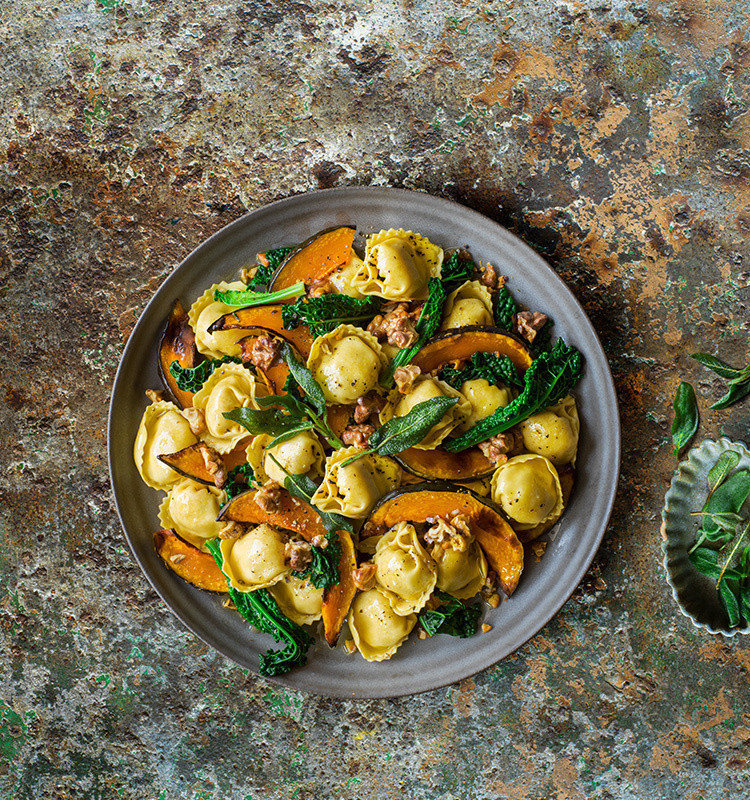 Sbollentate per circa 15 minuti la zucca lavata e mondata a spicchi, passatela poi in una padella con una noce di burro salvia, noci e broccolo riccio. Lasciate che cuocia per 5 minuti. Cuocete i tortellacci in abbondante acqua leggermente salata e scolateli dopo il tempo indicato sulla confezione. Saltate i tortelli con zucca, salvia e nocciole completate con una spolverata di parmigiano.