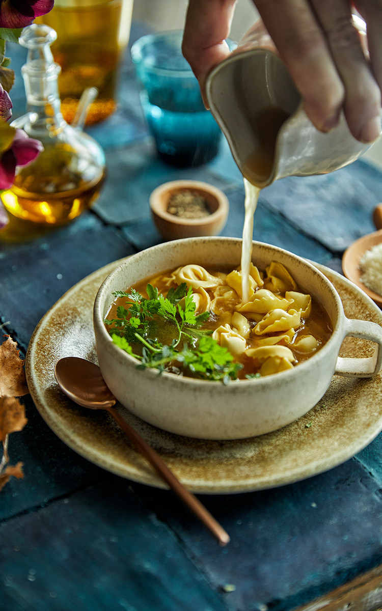 Anni ed anni di ricerca e innovazione ci hanno portato a creare la sfoglia più sottile di sempre... così sottile, ma così sottile, che la pasta si cuoce… a tavola! Sì, a tavola. Succede tra i commensali, incuriositi da questo rituale che ricorda quello del tè ma parla di pasta. Scopriamo insieme come fare. Per preparare il brodo di cappone cominciate lavando per bene le verdure. Spuntate sedano e carota e spellate la cipolla, poi tagliatele in grandi pezzi irregolari e raccoglieteli in una pentola molto capiente. Aggiungete i grani di pepe, il sale e la foglia di alloro per rendere più unico e persistente il profumo del brodo. Adagiate il cappone, precedentemente pulito, nella pentola con le verdure e gli aromi. Copritelo con abbondante acqua fredda. Ponetelo sul fuoco, aggiustate di sale e portate a bollore lentamente. Mantenete questa leggera ebollizione e cuocete per un paio d’ore. Quando mancano pochi minuti alla fine della preparazione del brodo, adagiate circa 125 grammi di tortellini crudi nei piatti fondi disposti sulla tavola. Per una perfetta riuscita, le fondine dovrebbero essere di grandezza medio-piccola. Aggiungete ad ogni piatto anche qualche foglia fresca di prezzemolo e cerfoglio. A questo punto la preparazione del brodo sarà terminata e si potranno separare, con l’aiuto di un colino, le carni e le verdure dalla parte liquida. Riporre il brodo in una teiera. Versate il brodo davvero bollente in ogni fondina e coprite subito con un piattino che funga da coperchio. Cronometrate ed attendete due minuti e mezzo per permettere la cottura in diretta dei tortellini nei piatti. Trascorso il tempo indicato, guarniteli con una generosa manciata di Parmigiano Reggiano appena grattugiato. Buon appetito!